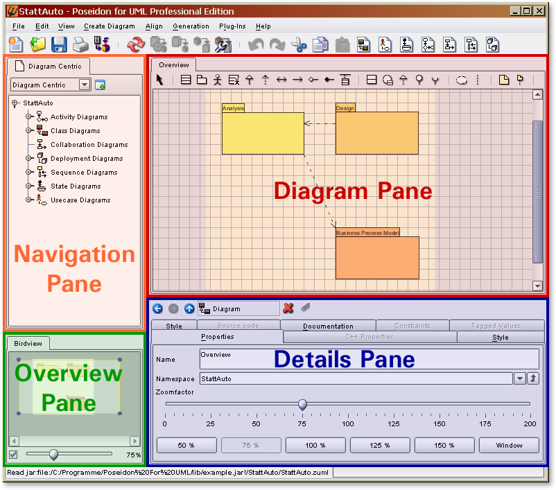 ![]() POSEJDON for UML Professional Edition Opracowanie Michał Małek na podstawie official user guide @ http://gentleware.com/fileadmin/media/archives/userguides/poseidon_users_guide/book1.html www.gentleware.com UML ułatwia projektowanie UML (ang. Unified Modeling Language czyli Ujednolicony Język Modelowania) - język formalny służący do opisu świata obiektów w analizie obiektowej oraz programowaniu obiektowym. Służy do modelowania dziedziny problemu (opisywania-modelowania fragmentu istniejącej rzeczywistości - na przykład modelowanie tego, czym zajmuje się jakiś dział w firmie) - w przypadku stosowania go do analizy, oraz do modelowania rzeczywistości, która ma dopiero powstać - tworzy się w nim głównie modele systemów informatycznych. UML jest głównie używany wraz z jego reprezentacją graficzną - jego elementom przypisane są symbole, które wiązane są ze sobą na diagramach. Uniwersalnym formatem zapisu języka UML jest XMI - język służący do zapisywania modeli UML za pomocą XML'a. Posejdon for UML „Posejdon for UML Professional Edition” jest najważniejszą edycją aplikacji „Poseidon for UML”. Narzędzie to zostało stworzone by sprostać wymaganiom profesjonalnych deweloperów. Zawiera w sobie mechanizmy, które pozwalają na generowanie kodu w sposób bardzo elastyczny i wygodny. Edycja profesjonalna pakietu zawiera możliwość tak zwanego „round-trip engineering” czyli inżynierii odwrotnej, import archiwów JAR oraz generowania dokumentacji w formacie HTML. Jedną z najważniejszych zalet profesjonalnej edycji Posejdona jest możliwość generowania kodu, która nie jest niczym ograniczona. Mechanizm generowania kodu jest oparty na technologii szablonów (wzorców) gdzie wzorzec definiuje składnię wygenerowanego kodu. Możliwość generowania kodu istnieje dla języków i formatów takich jak Java, C++, ANSI C, Delphi, PHP, VB.net, Perl, XML, HTML. Edycja profesjonalna daje programiście dostęp do API i do wzorców. Deweloper może edytować i zmieniać te wzorce nawet podczas wykonywania programu i wpływać na wynik generowanego kodu osobiście. Wyszukane mechanizmy inżynierii odwrotnej pozwalają na czytanie kodu Javy i generowanie diagramów w notacji UML i synchronizacji wyników z projektem. Można zmieniać wygenerowany kod oraz edytować wygenerowany model. Wraz z umożliwieniem funkcji importu z archiwów JAR można czytać w istniejących bibliotekach i używać ich elementów w tworzonym projekcie. Profesjonalna edycja Posejdona zawiera więc między innymi takie funkcjonalności jak : - Generowanie kodu na podstawie wzorców z pełnym dostępem - Funkcjonalność inżynierii odwrotnej dla języka Java - Import archiwów JAR w celu wykorzystania istniejących bibliotek - Import plików z komercyjnej aplikacji Rational Rose (.mdl). Wymagania aplikacji Posejdon jest napisany w Javie więc jest niezależny od platformy. Uruchamia się prawdopodobnie na każdym nowoczesnym komputerze. Do sukcesywnego działania aplikacji wymagane są jednak Środowisko uruchomieniowe javy od wersji 1.4 dla systemów Linux, Mac OS X oraz Windows. Poseidon nie działa w wersji javy 1.3 i starszych. Komputer z rozsądną ilością pamięci i mocnym procesorem. 512 MB pamięci RAM jest rekomendowane ale większa ilość jest dosyć pomocna. Procesor Pentium III to absolutne minimum. Specyficzny sytem operacyjny nie jest wymagany. Z sukcesami Posejdon działa w systemach Windows 98, 2000, NT oraz XP, a także na systemach Linux SuSe 6.X, 7.X, Red Hat jak i na MacOS X. W większości został jednak stworzony i testowany na systemie operacyjnym Linux. Jednakże w systemie Windows osiągi programu wydają się lepsze ze względu na szybsze środowisko uruchomieniowe Javy. Obszar roboczy programu Obszar roboczy Posejdona składa się z pięciu osobnych elementów. U góry okna znajduje się główne menu programu oraz pasek narzędzi, który zapewnia dostęp do najważniejszych funkcji. Poniżej znajdują się cztery okna wewnętrzne : ![]() Diagram Pane (okno diagramu) - Największe okno programu - Ulokowane w górnej prawej części ekranu - Wyświetla różne diagramy UML i jest głównym obszarem pracy Navigation Pane (okno nawigacji) - Okno ulokowane w górnej lewej części ekranu - Wyświetla modele i elementy modeli bazując na wybranym widoku - Zapewnia szybkie i intuicyjne poruszanie się po diagramach Overview Pane (okno podglądu projektu) - Okno ulokowane w dolnej lewej części ekranu - Widok z „lotu ptaka” zapewnia możliwie szybki dostęp do elementów projektu - Zwykle najmniejsze okno obszaru roboczego Details Pane (okno podglądu szczegółów) - Okno ulokowane w dolnej prawej części ekranu - Wyświetla wszystkie informacje o zaznaczonych elementach projektu, szczególnie ważne gdyż wyświetla cechy obiektów, które nie mogą być wyświetlone na głównym diagramie - Zapewnia możliwość edycji i zmiany cech zaznaczonych obiektów Okna programu można ukrywać oraz zmieniać ich wielkość jak w większości aplikacji. Navigation Pane (okno nawigacji) ![]() Okno nawigacji jest używane by zaprezentować elementy projektu w różnych wariantach postaci drzewa. Jest wiele sposobów w jakie można wyświetlić informacje o projekcie : np. można wyświetlić elementy drzewa poukładane alfabetycznie, według nazwy diagramu,według typów elementów, według klas, dziedziczenia, pakietów oraz stanów. The Diagram Pane (okno diagramu) ![]() Ponieważ diagramy są sercem UML'a, dlatego też okno diagramu jest głównym oknem przestrzeni roboczej. Jest to miejsce w którym konstruuje się i edytuje diagramy wchodzące w skład projektu. Okno używa mechanizmu zakładek co daje nam możliwości łatwego konfigurowania i przełączania się między poszczególnymi diagramami. The Details Panel (okno podglądu szczegółów) ![]() Okno szczegółów to okno w którym można zobaczyć informacje które ze względu na czyte
