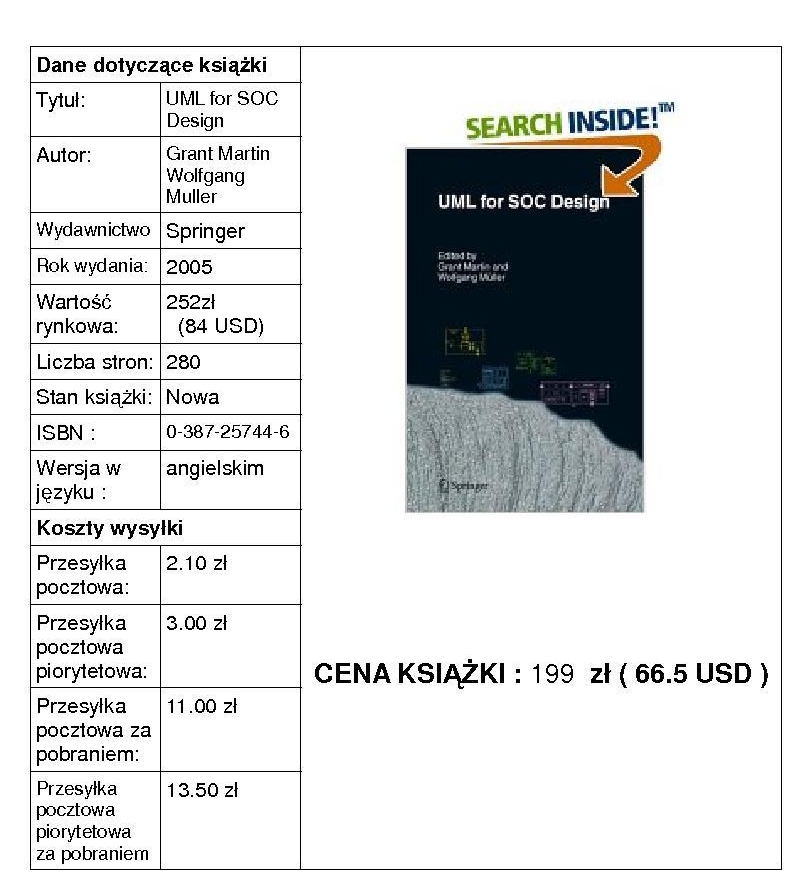 UML for SOC Design![]() Zamówienia prosimy składać drogą mejlową, telefoniczną, gg, skype, faxem.